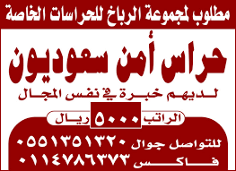 مطلوب لمجموعة الرباخ للحراسات الخاصة حراس أمن سعوديون